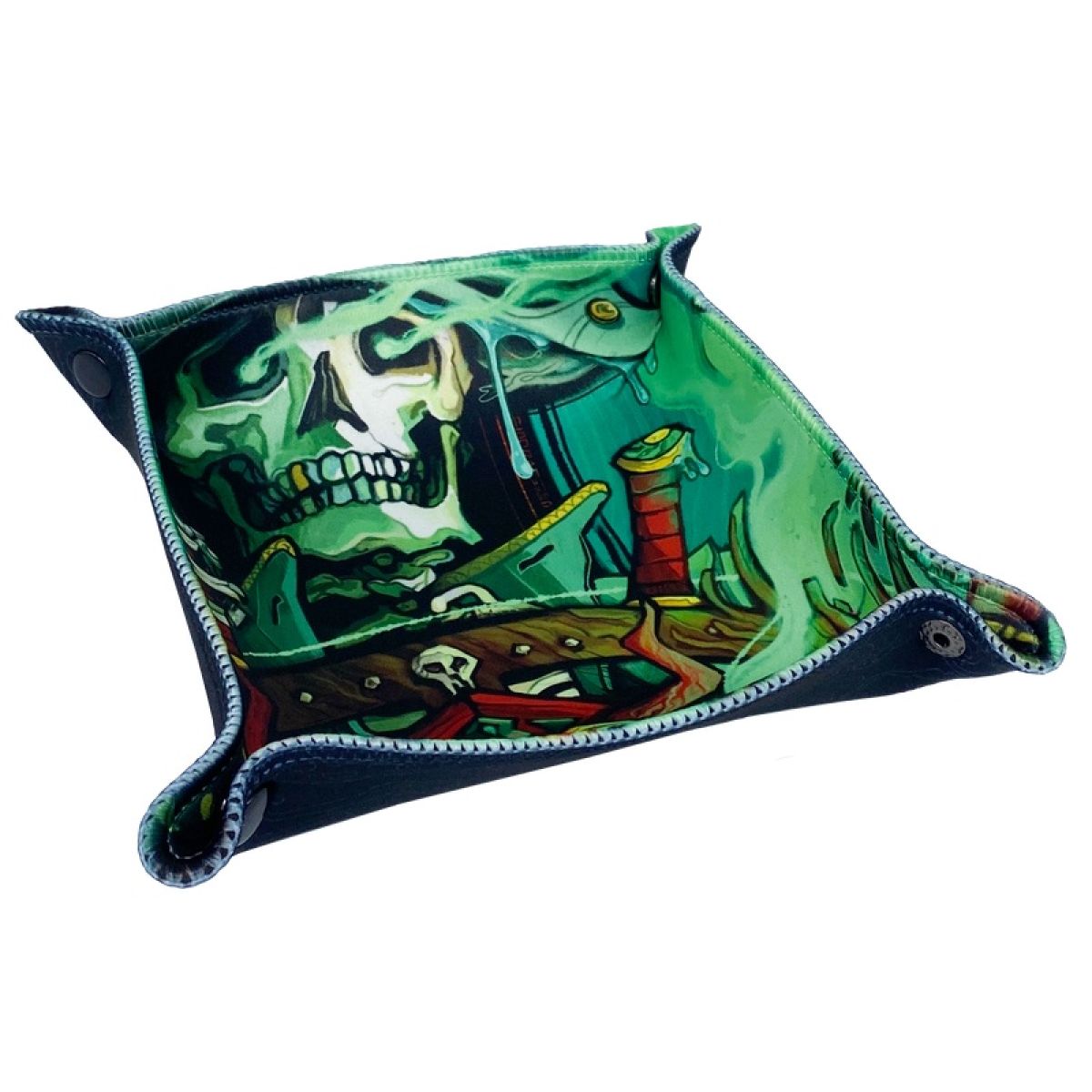 The Rapscallion Dice Tray is a beautiful and useful accessory for Rapscallion, the roleplaying game. Made of a full-color flexible rubber sheet with a fabric cover and buttons, it easily assembles into a beautiful rolling dice tray at your table. The dice tray features incredible art from Whistler—the writer and designer of Rapscallion—that serves as the perfect backdrop for your journeys on the Great Sea!